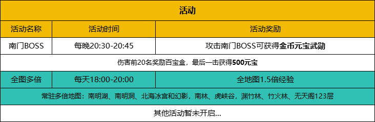 1.南门BOSS活动,每晚20:00——20:10,所有玩家均可参与,通过攻击BOSS获得金币武勋元宝等奖励